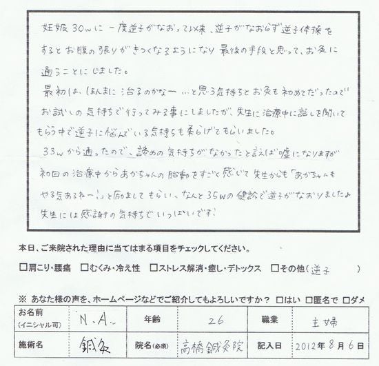 逆子に悩んでいる気持ちも柔らげてもらいました。
