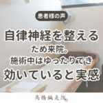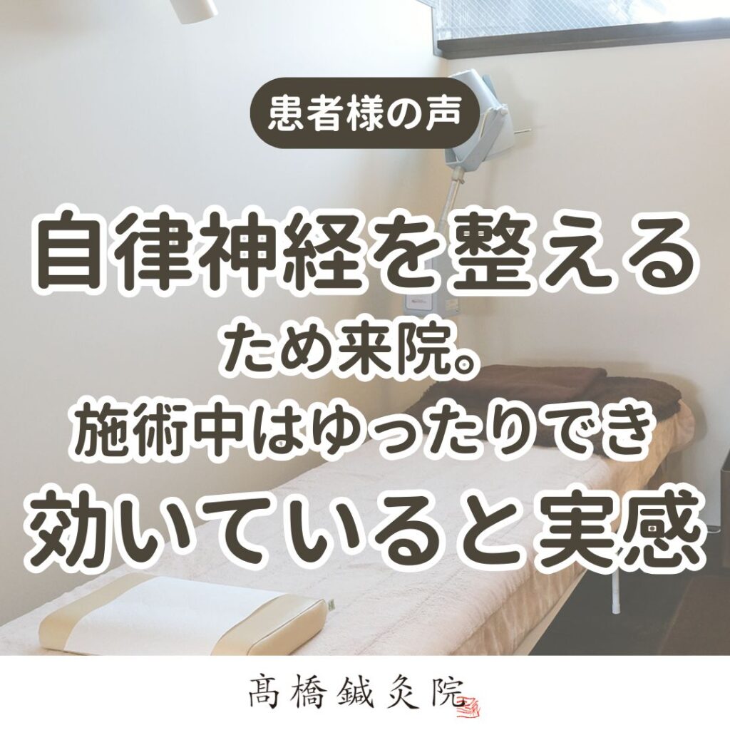 自律神経の乱れは、生活するうえで様々な影響を及ぼします。鍼やお灸で自律神経を整えることはもちろん、院内の内装や落ち着いた雰囲気、施術者とのお話しを通して、よりリラックスできるように工夫していますので、「効いている」とご感想をいただけて嬉しいです。