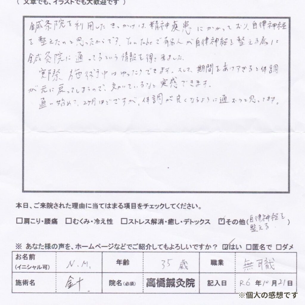 鍼条院を利用したきっかけは、精神変患にかかっており、自律神経を整えたいと思ったからです。YouTubeで有名人が自律神経を経える為に鍼灸院に通ってるという情報を得て来ました。