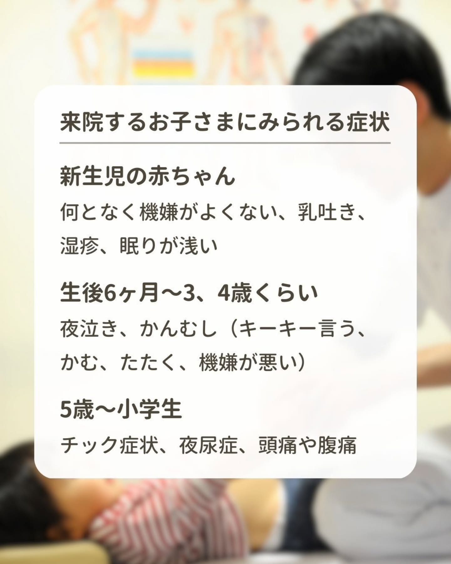 はり・きゅうは「病院に行くほどではないけど悩んでいる」という症状や体質を診るのが得意。当院では、お子さまのいろんなお悩みをお伺いしてきました。