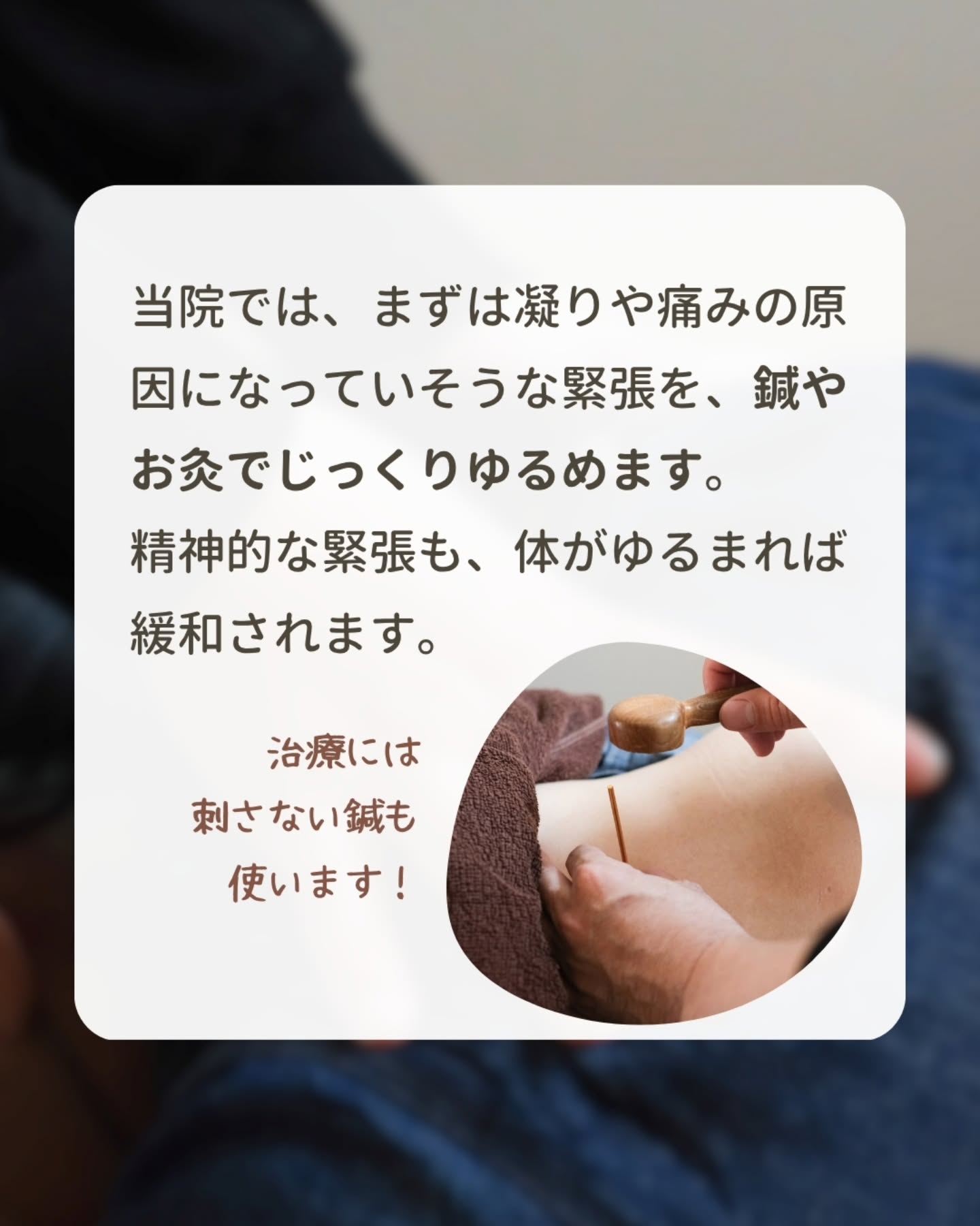 当院では、まずは凝りや痛みの原因になっていそうな緊張を、鍼やお灸でじっくりゆるめていきます。精神的な緊張も体がゆるまれば緩和されます。