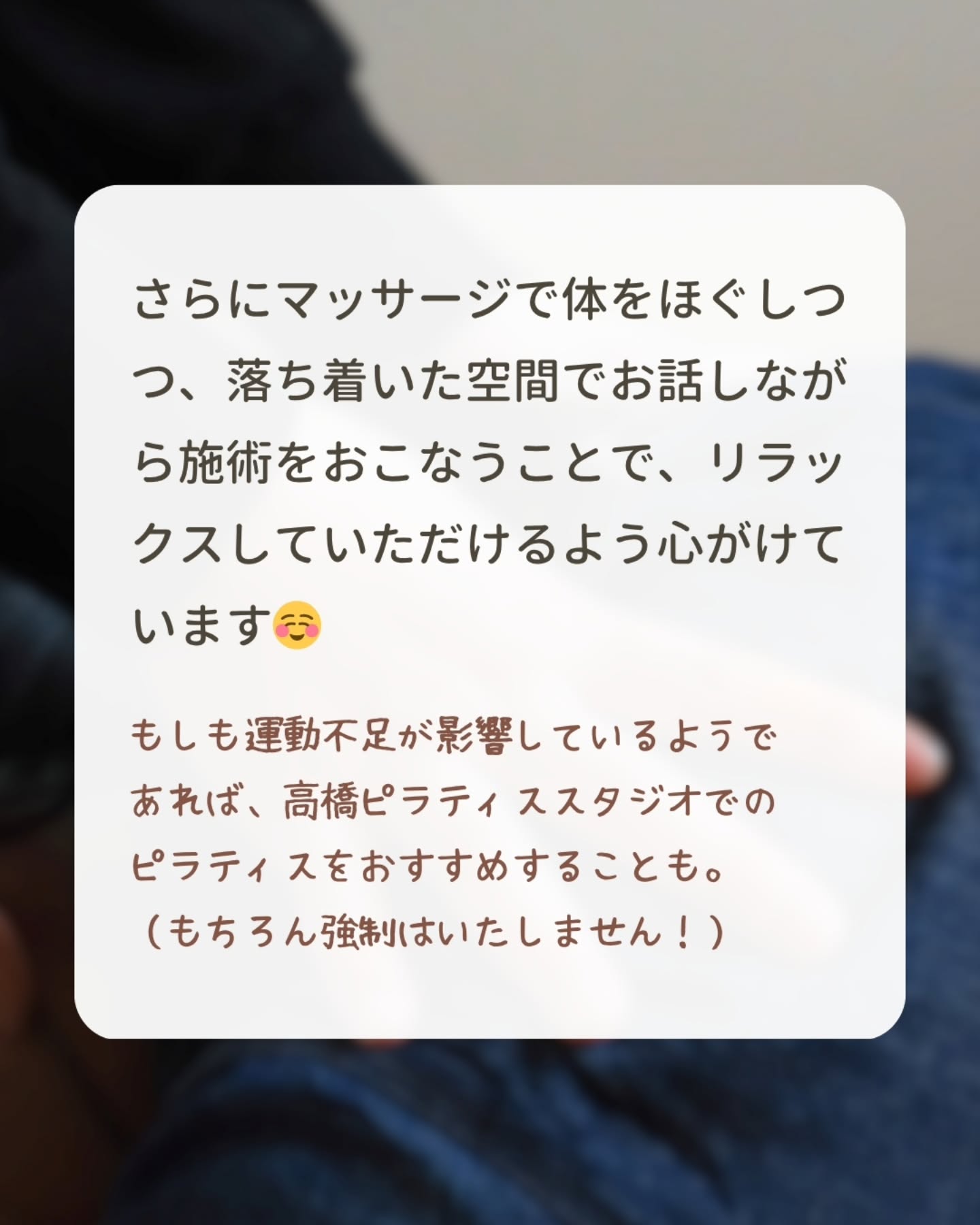 さらにマッサージで体をほぐしつつ、落ち着いた空間でお話しながら施術をおこなうことで、リラックスしていただけるよう心がけています️。