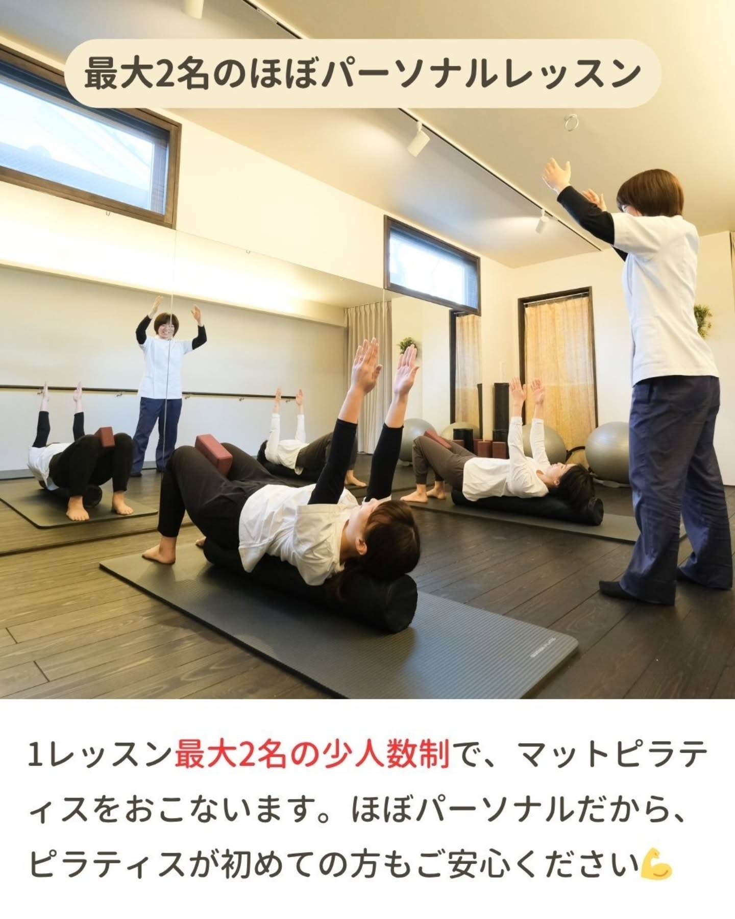1レッスンにつき最大2名までの少人数制。おひとりおひとりに合わせたマットピラティスのプログラムをおこないます。