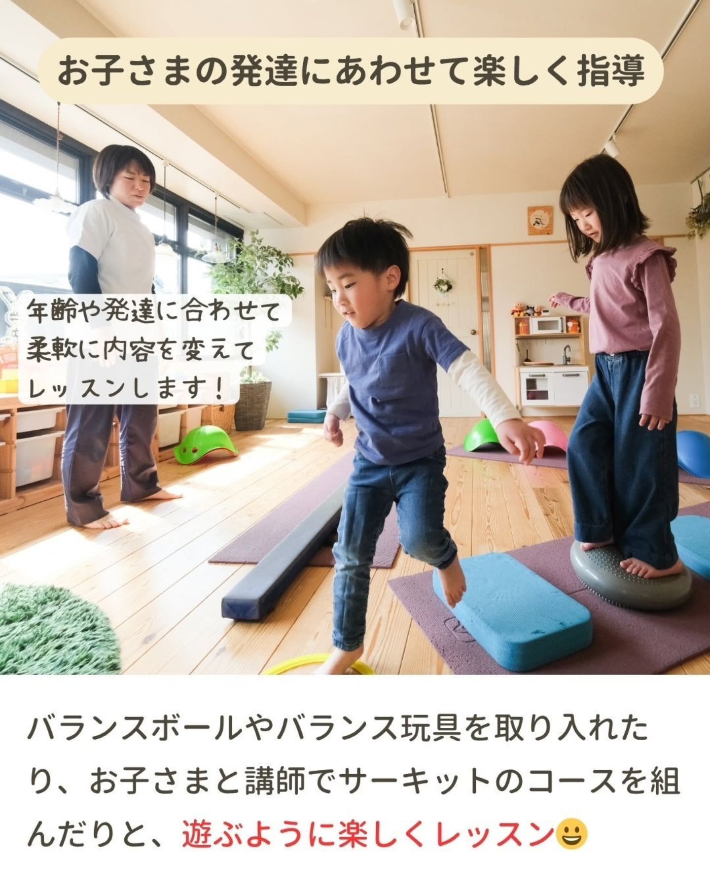 1〜3名までの少人数制レッスンで、講師が30分間つきっきりで指導。バランスボールやバランス玩具を取り入れたり、お子さまと講師でサーキットのコースを組んだりと、遊ぶように楽しくレッスンします。
