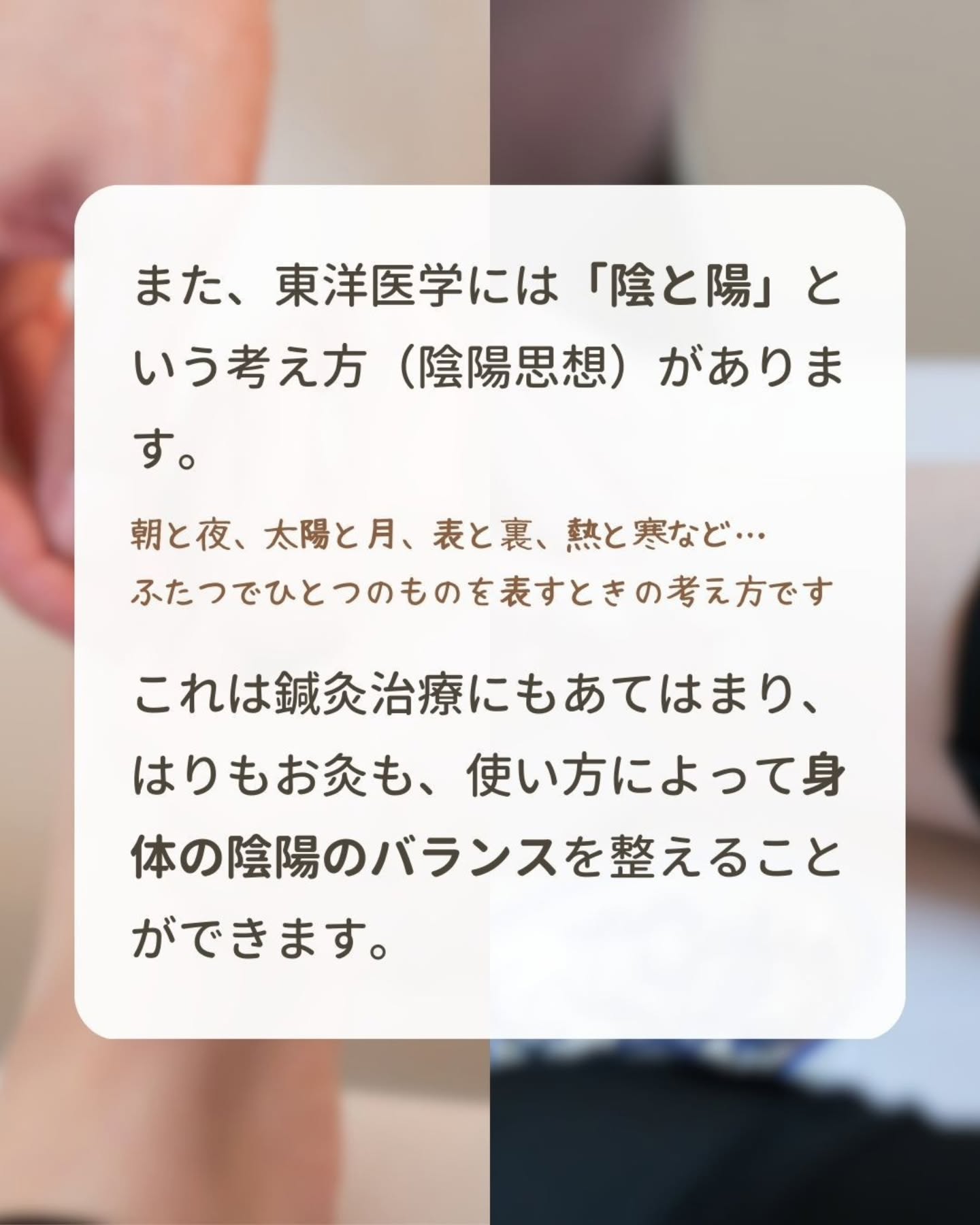 これは鍼灸治療にもあてはまり、はりもお灸も、使い方によって身体の陰陽のバランスを整えることができます。