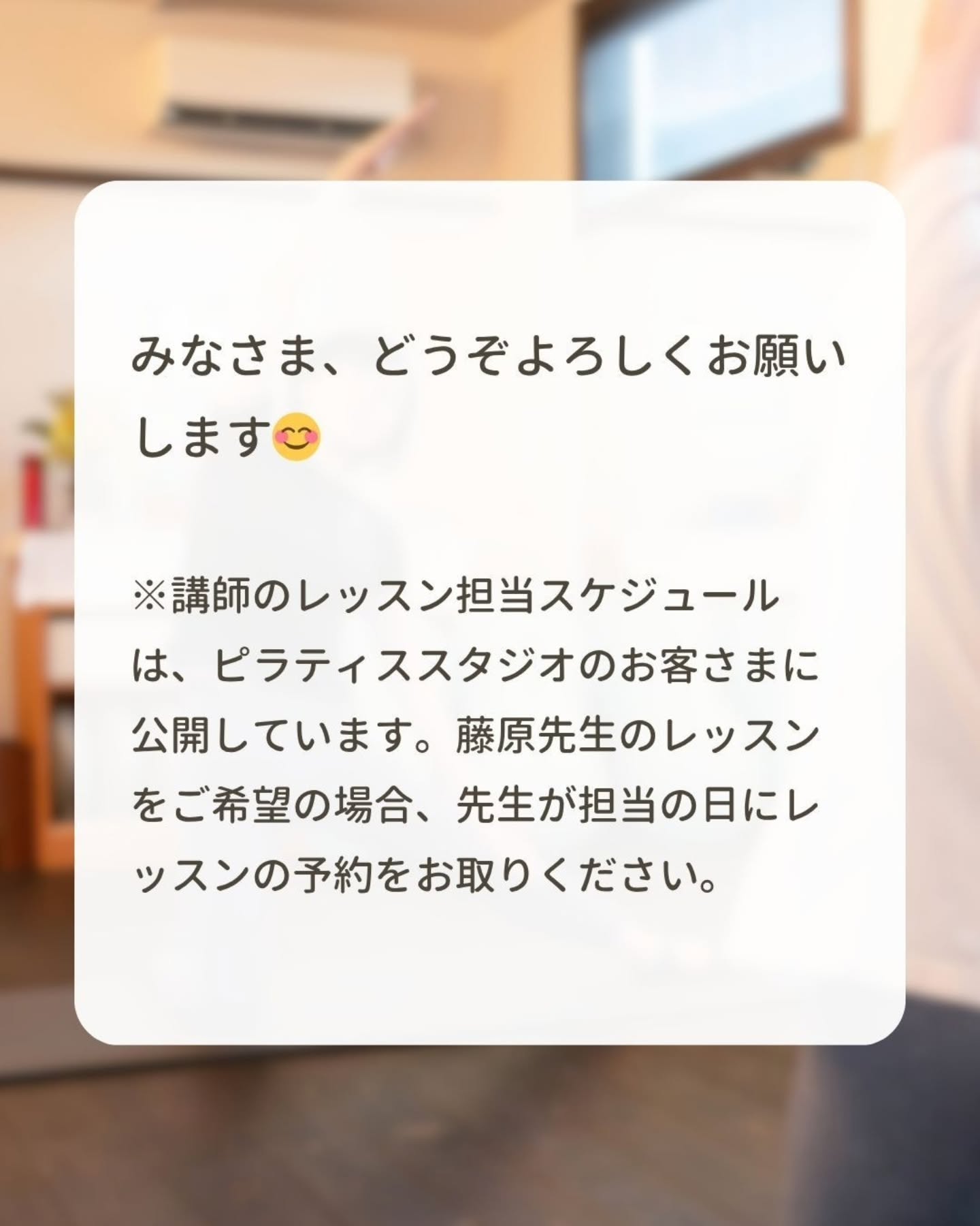 今回はピラティス講師をつとめる 藤原(ふじわら)先生 です。