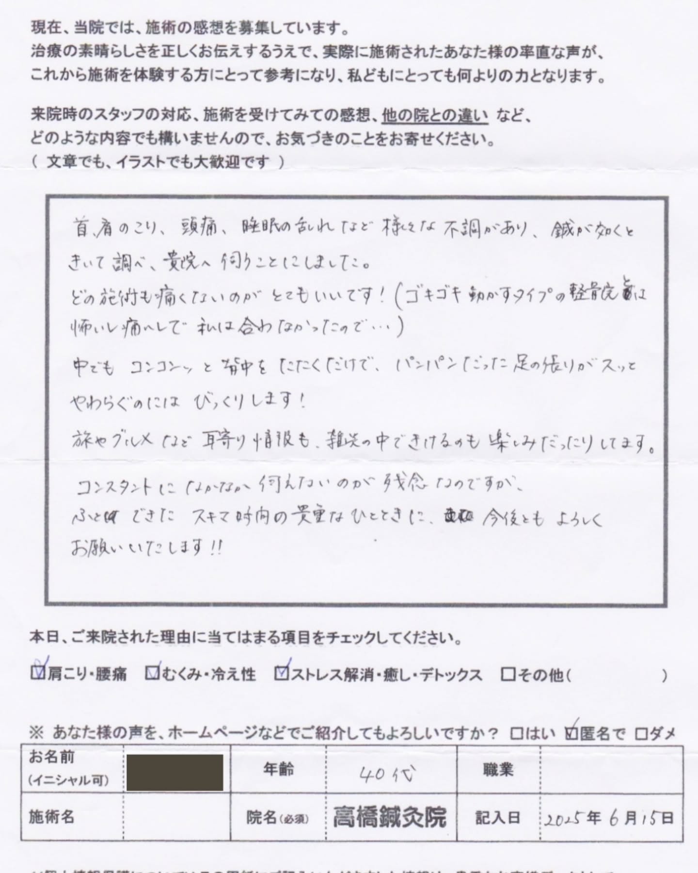 「首、肩のこり、頭痛、睡眠の乱れなど様々な不調があり、鍼が効くときいて調べ、貴院へ伺うことにしました。