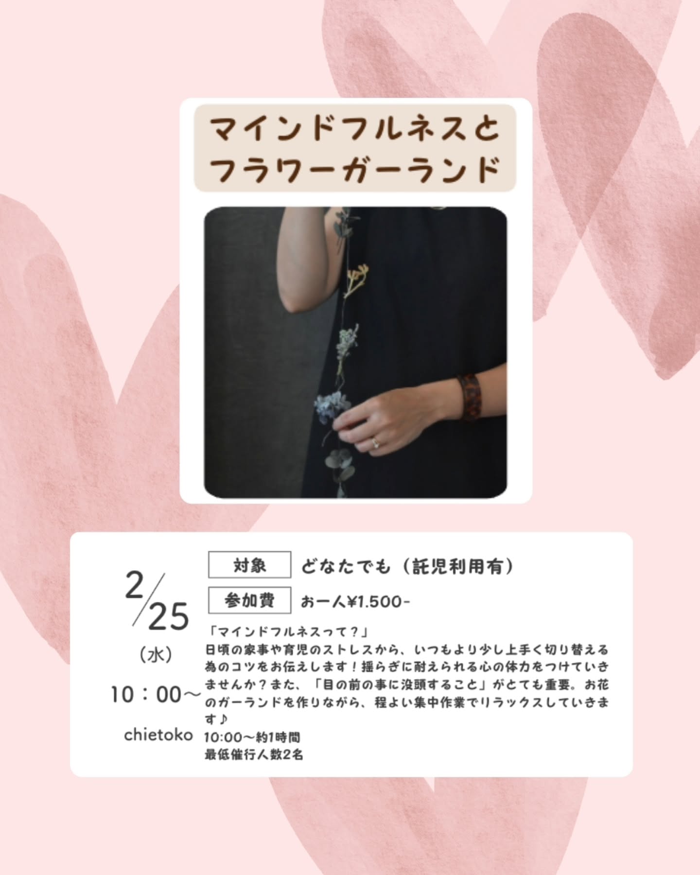 また、「目の前の事に没頭すること」がとても重要。お花のガーランドを作りながら、程よい集中作業でリラックスしていきます♪