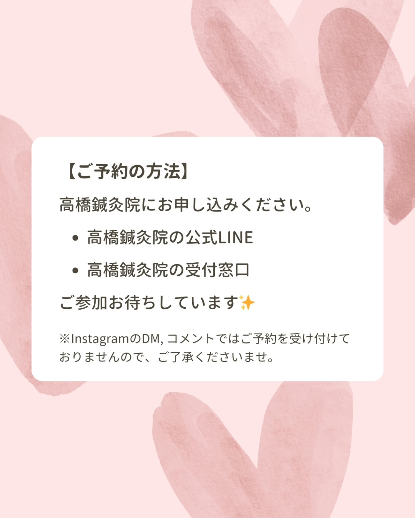 ※InstagramのDM, コメントではご予約を受け付けておりませんので、ご了承くださいませ。