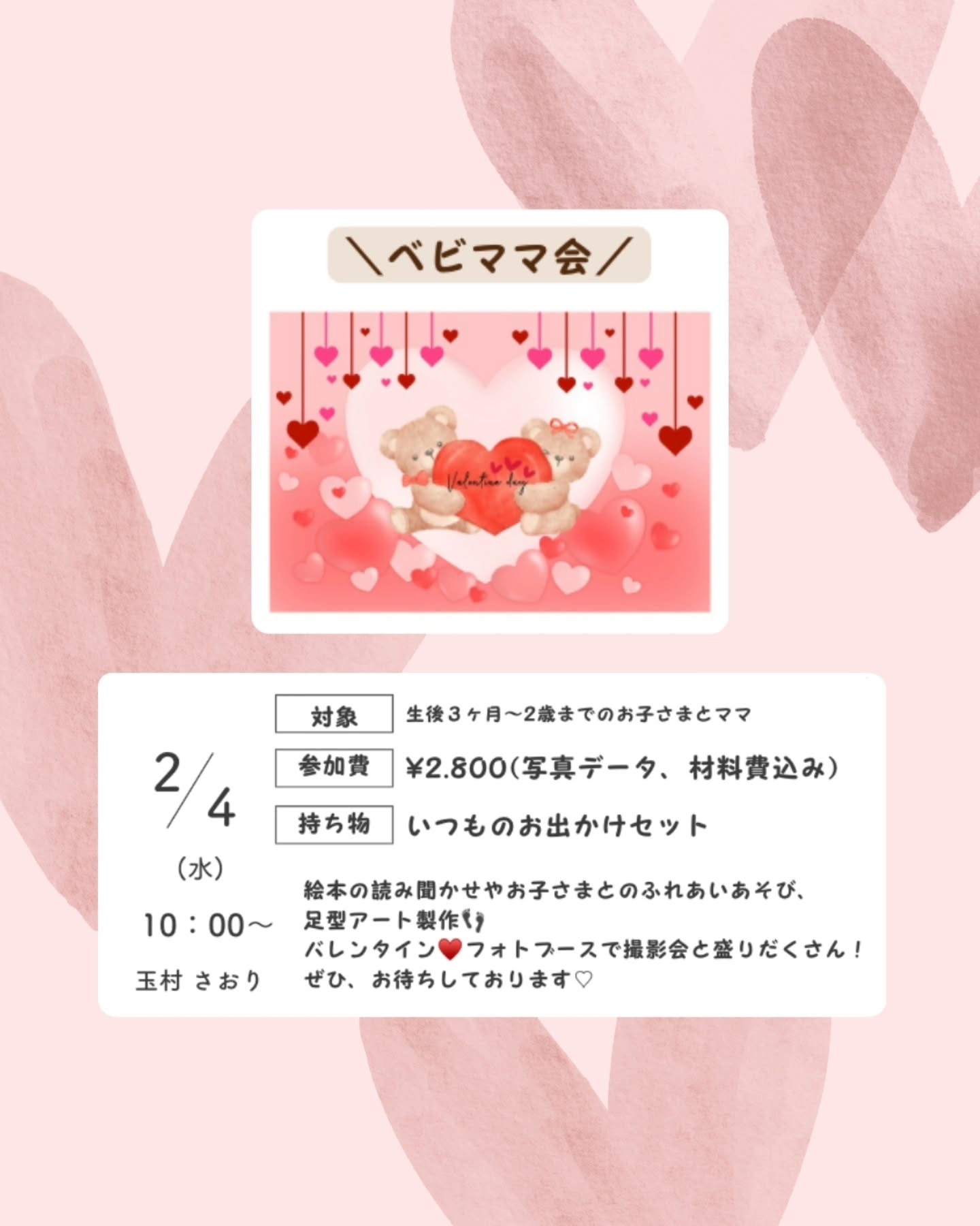 絵本の読み聞かせやお子さまとのふれあいあそび、足型アート製作、バレンタイン️フォトブースで撮影会と盛りだくさん!