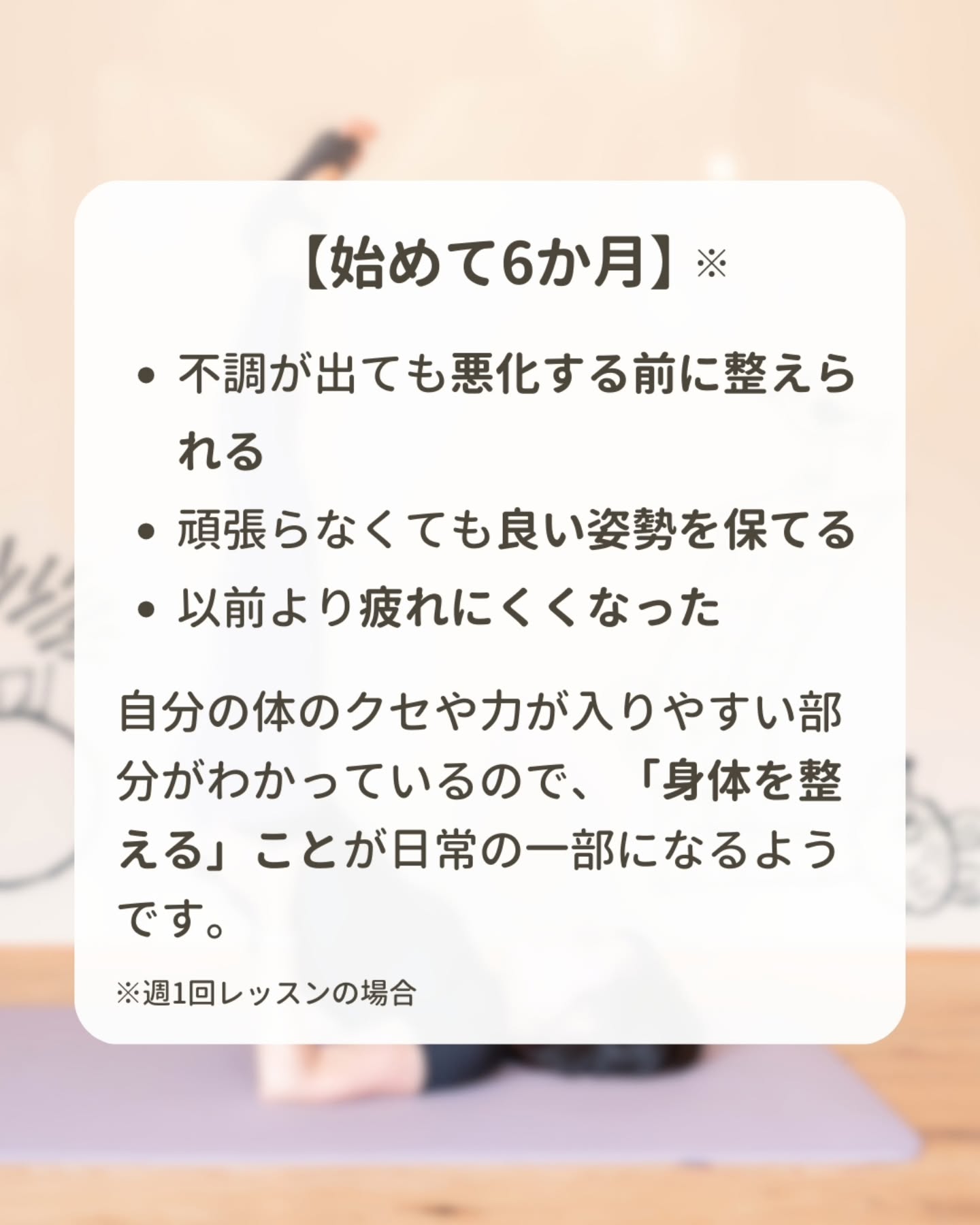 身体に合った動きを積み重ねることで、ピラティスを無理なく続けやすくなり、不調が出にくい身体へと変わっていきます。